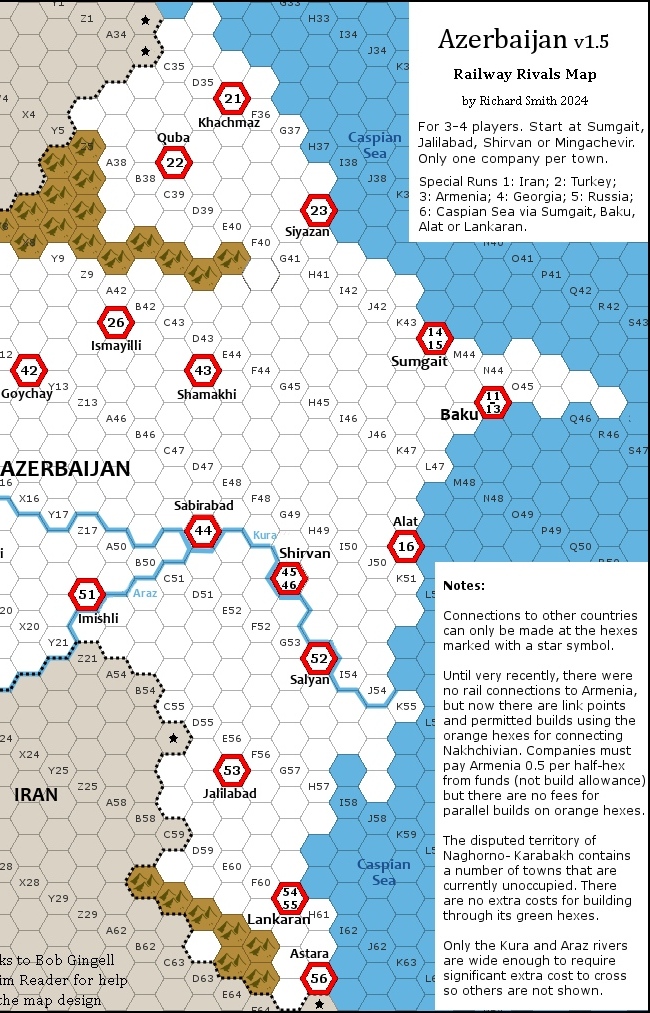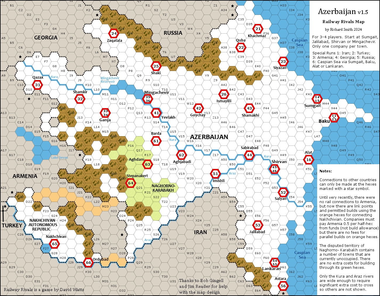 The disputed territory of Naghoro-Karabakh is effectively part of Azerbaijan, but the mainly Armenian population have evacuated most of the towns in the area. Until recently there were no working rail connections to Armenia or Nakhchivan Autonomous Republic but these are now being reopened, see Pashinyan rail link For more information about the railway system in Azerbaijan, see Rail Transport in Azerbaijan and Azerbaijan Railways As with quite a few other recent maps, half images are available for those without access to an A3 printer (sellotape required). |