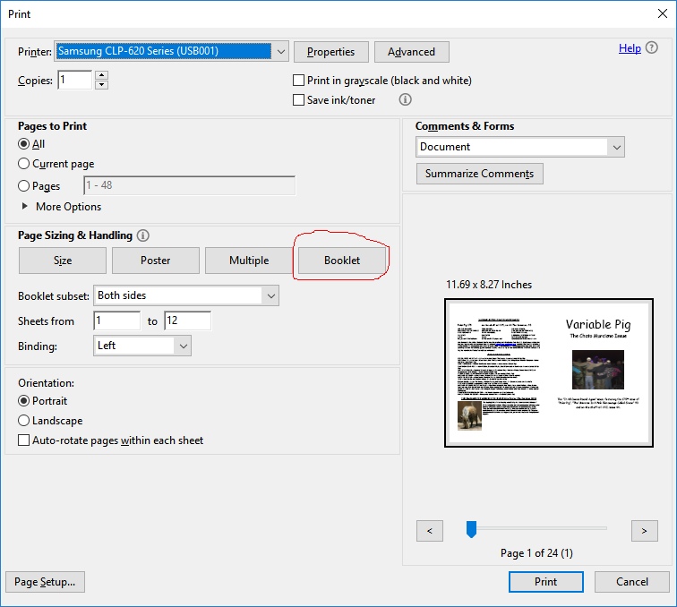 Variable Pig issues are A4 PDFs with a divisible-by-four page count, ideal for printing the zine as an A5 booklet (2 pages on each side of each sheet). Whether or not your printer natively supports booklet mode, you can do this using the free Acrobat Reader DC program.